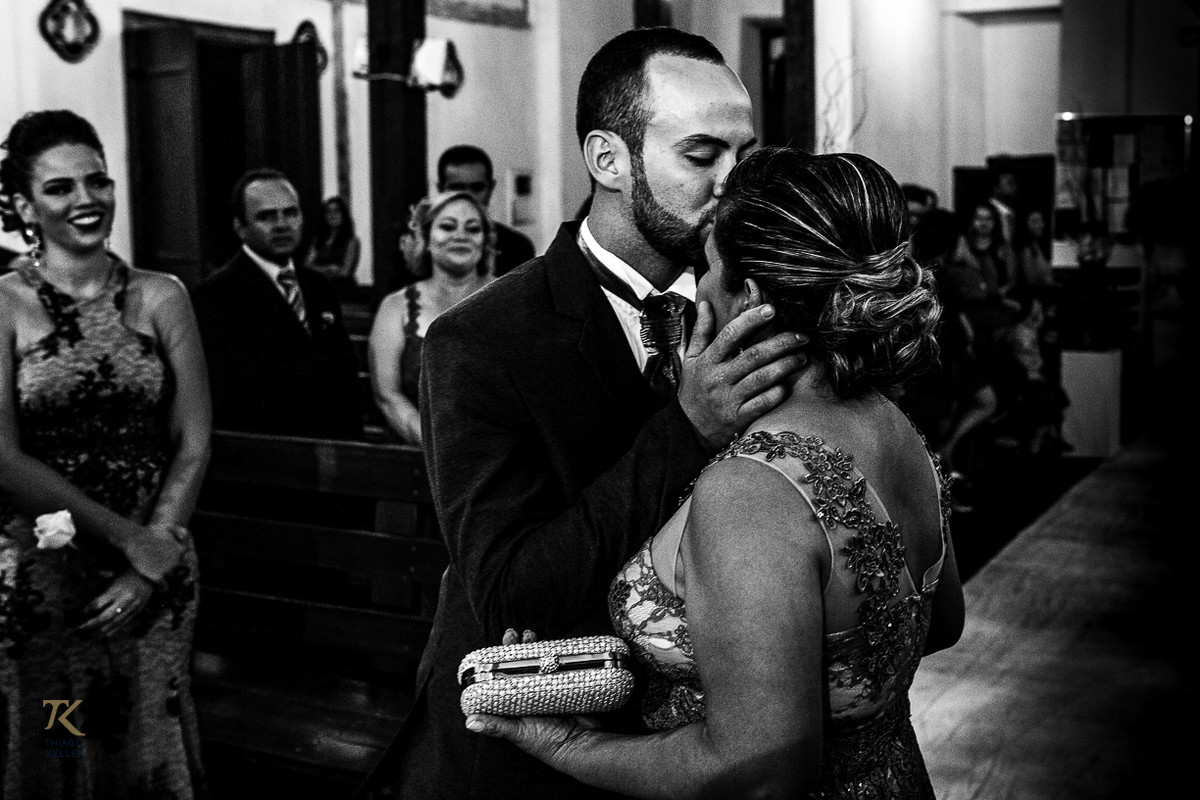 Fotografia de casamento de Lívia e Paulo Henrique na cidade de Paracatu, Minas Gerais. Entrada do noiva com sua mãe.