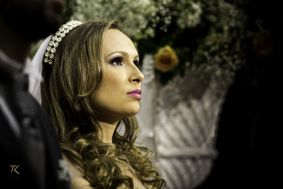 Fotografia de casamento de Lívia e Paulo Henrique na cidade de Paracatu, Minas Gerais. Noivos ouvem a liturgia durante a cerimônia.