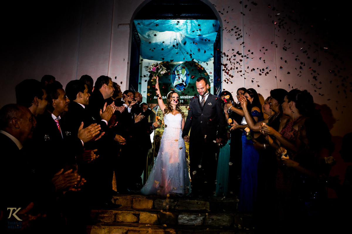 Fotografia de casamento de Lívia e Paulo Henrique na cidade de Paracatu, Minas Gerais. Casal comemora na saída da Igreja. Foto em Preto e Branco.